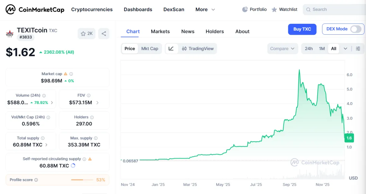 Texit Coin (TXC) is now traded on 9 major exchanges (with more coming) and is listed on CoinMarketCap with the following exchanges: BitMart, Dex-Trade, Ju.com, Pionex, Biconomy.com, UniSwap v2, MEXC, Picol and XT.COM.